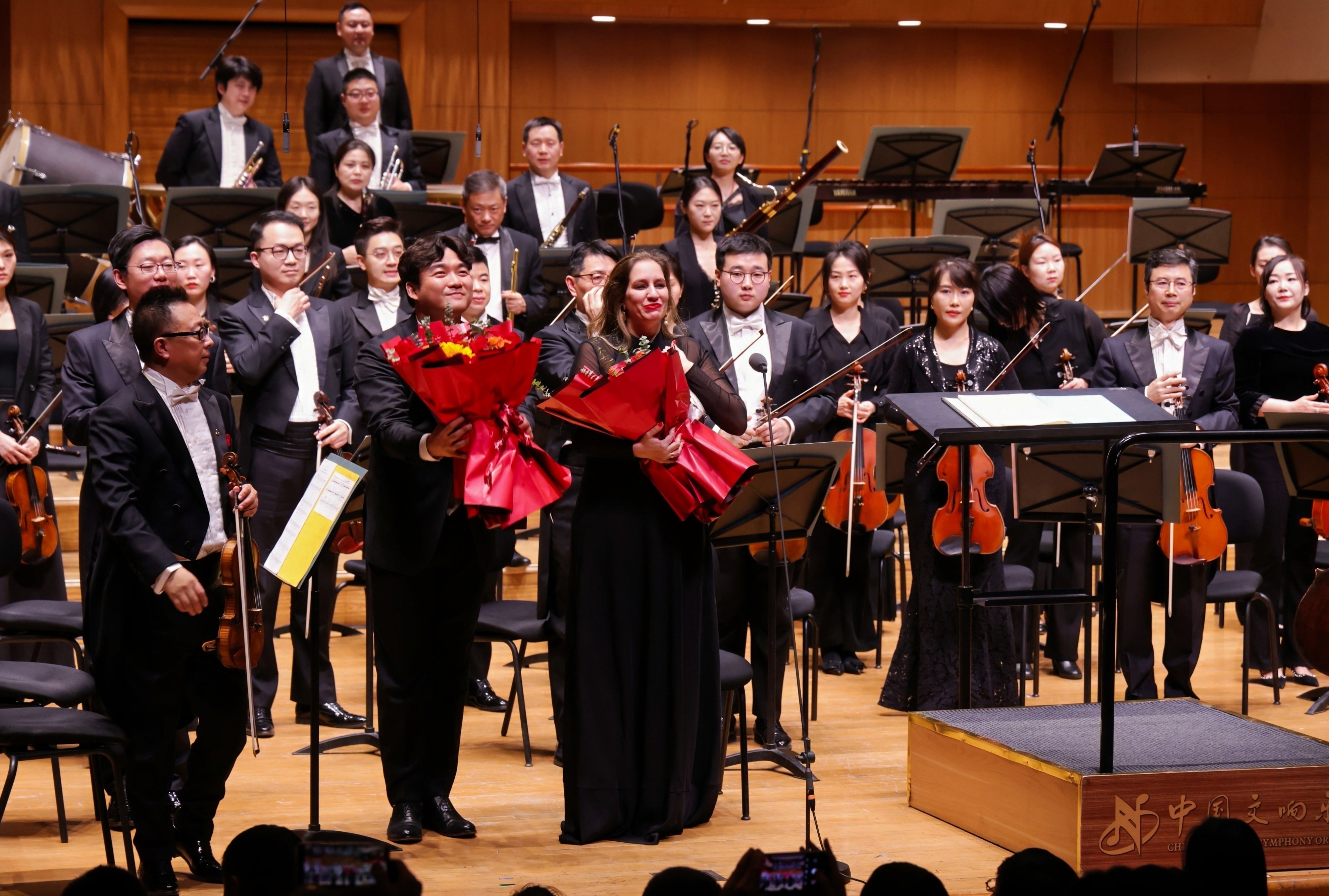 Conductor Shui Lan and composer ZhouLong pose after the concert by the CNSO at the Beijing Concert Hall on Sept 20 CHINA DAILY