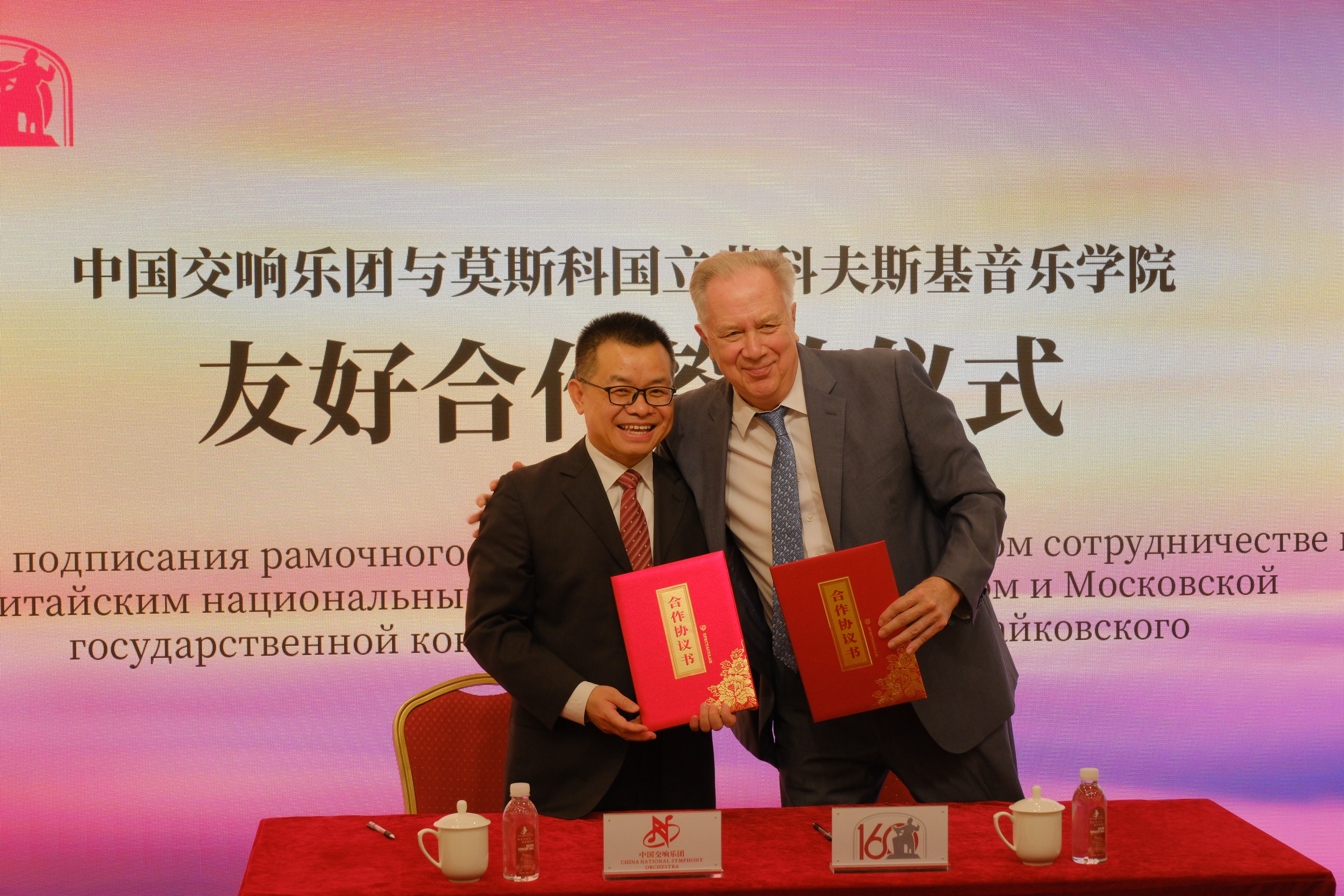 Zhou Yu,the Party Secretary of the China National Symphony Orchestra and Alexander Sokolov,rector of Tchaikovsky Moscow State Conservatory in Beijing on Sept 26